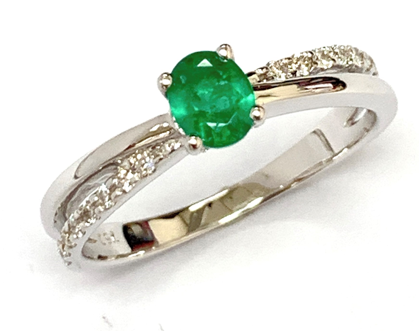 18K WHITE GOLD 0.12 CARAT BRILLIANT CUT DIAMOND 0.40 CARAT OVAL CUT EREMRALD G/H COLOUR, VS-SI CLARITY
